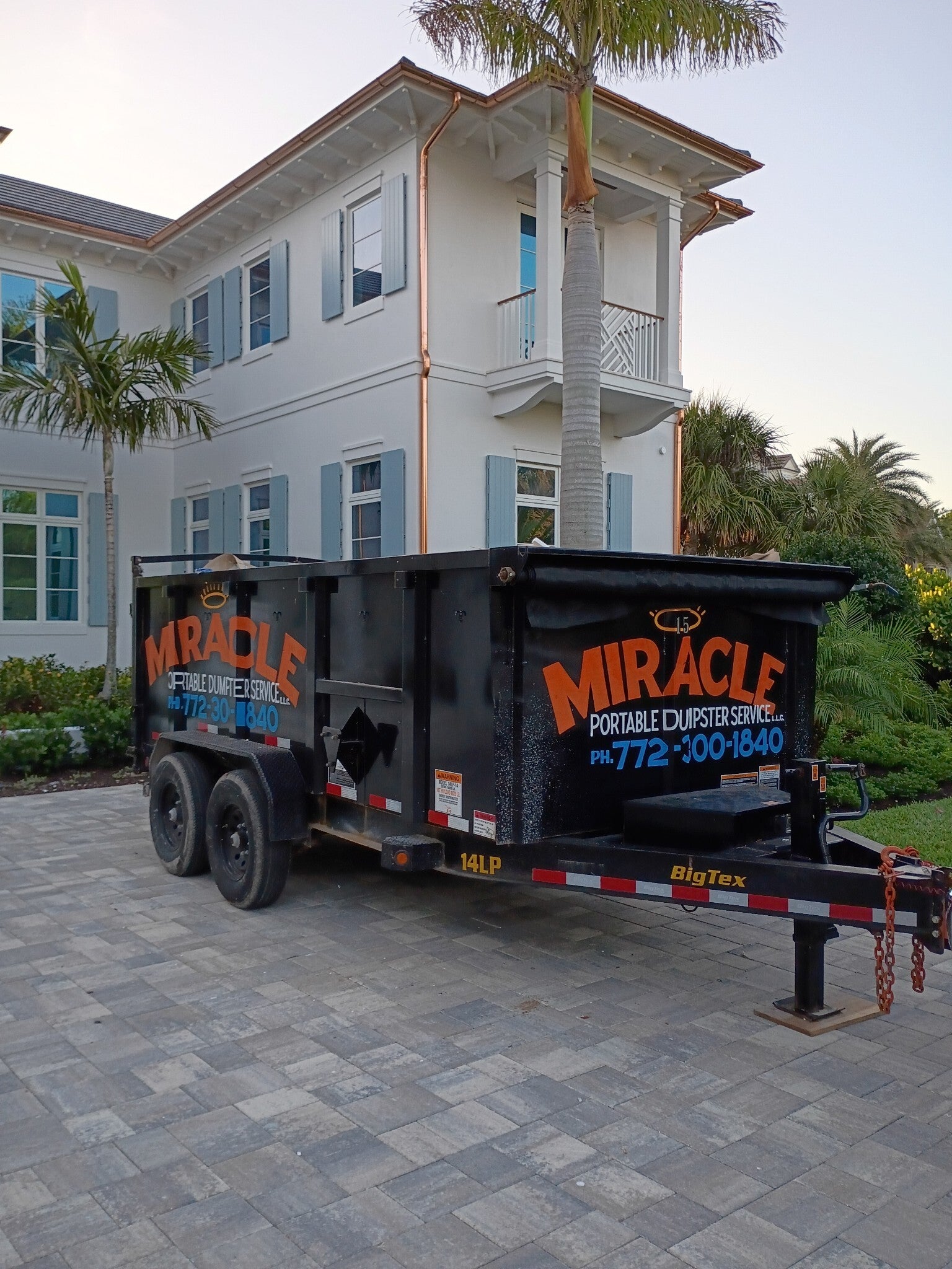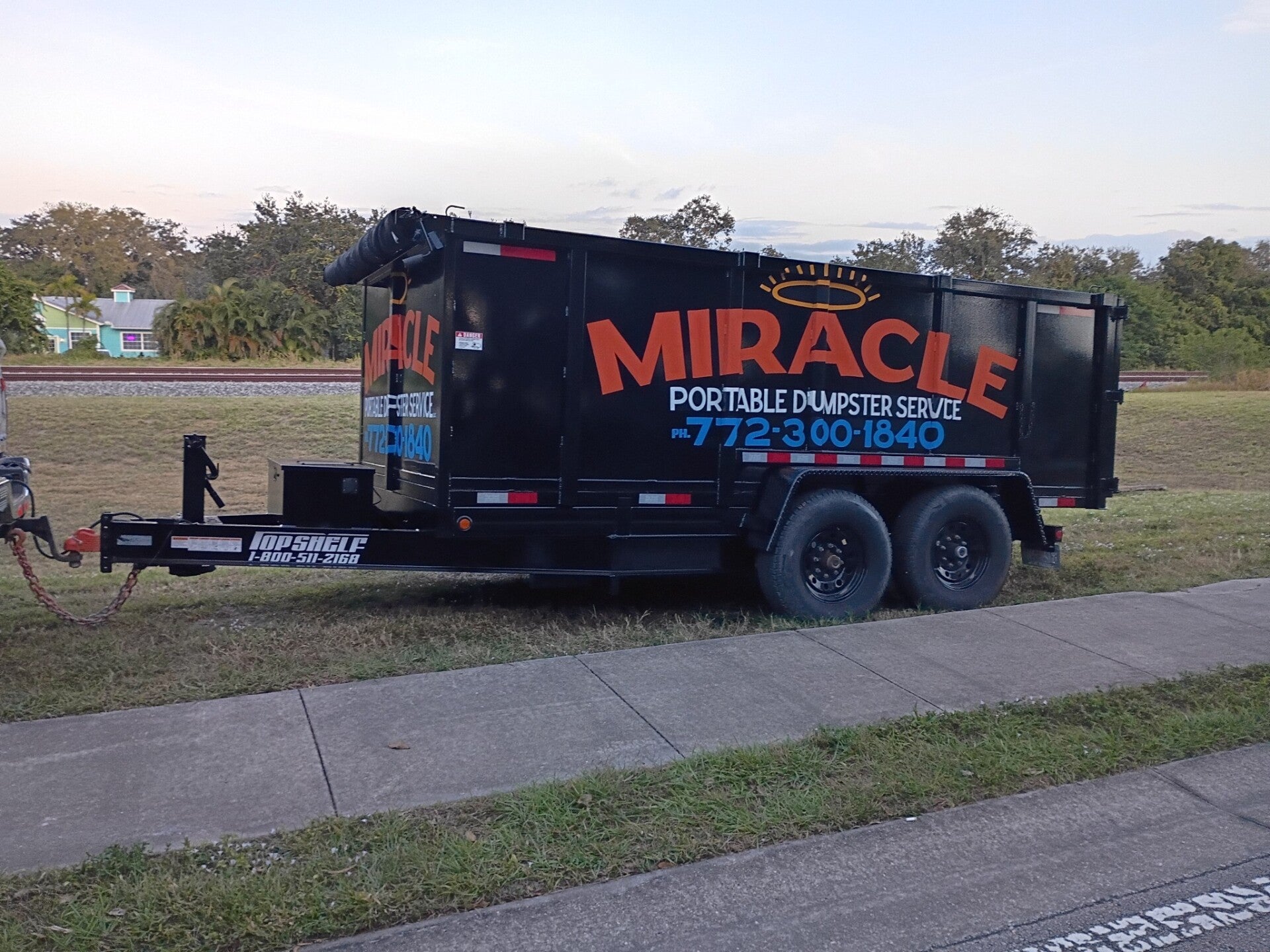 When you need a miracle for your junk removal, Miracle Portable Dumpster Service LLC is here to help! We offer fast, reliable, and affordable portable dumpster services in Indian River County. Our trailer-mounted dumpsters ensure damage-free driveway parking, unlike traditional roll-off options. Discover the convenience and peace of mind we provide for both commercial and residential projects. Licensed and insured, we are the largest portable dumpster business serving the local economy!