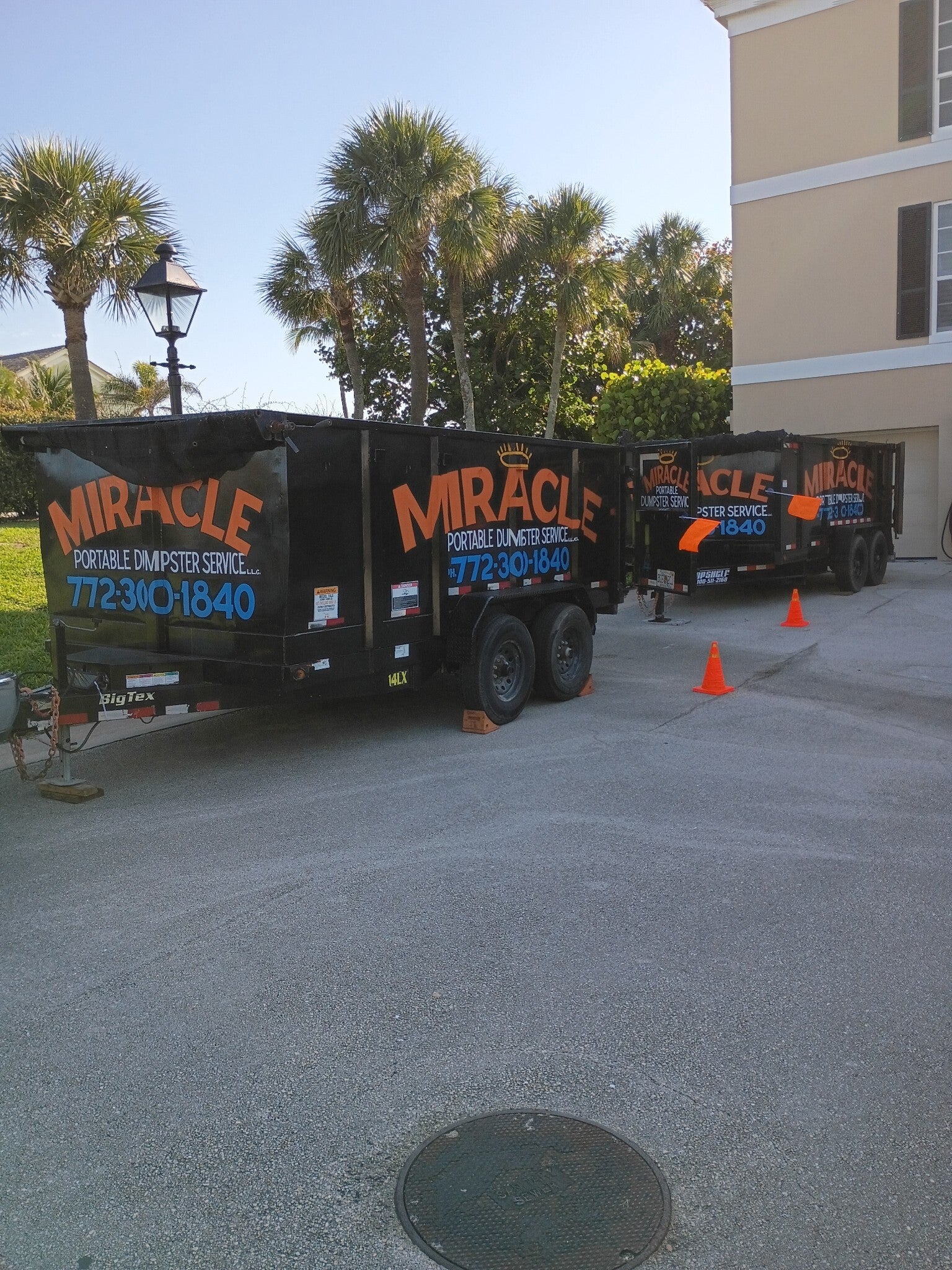 When you need a miracle for your junk removal, Miracle Portable Dumpster Service LLC is here to help! We offer fast, reliable, and affordable portable dumpster services in Indian River County. Our trailer-mounted dumpsters ensure damage-free driveway parking, unlike traditional roll-off options. Discover the convenience and peace of mind we provide for both commercial and residential projects. Licensed and insured, we are the largest portable dumpster business serving the local economy!